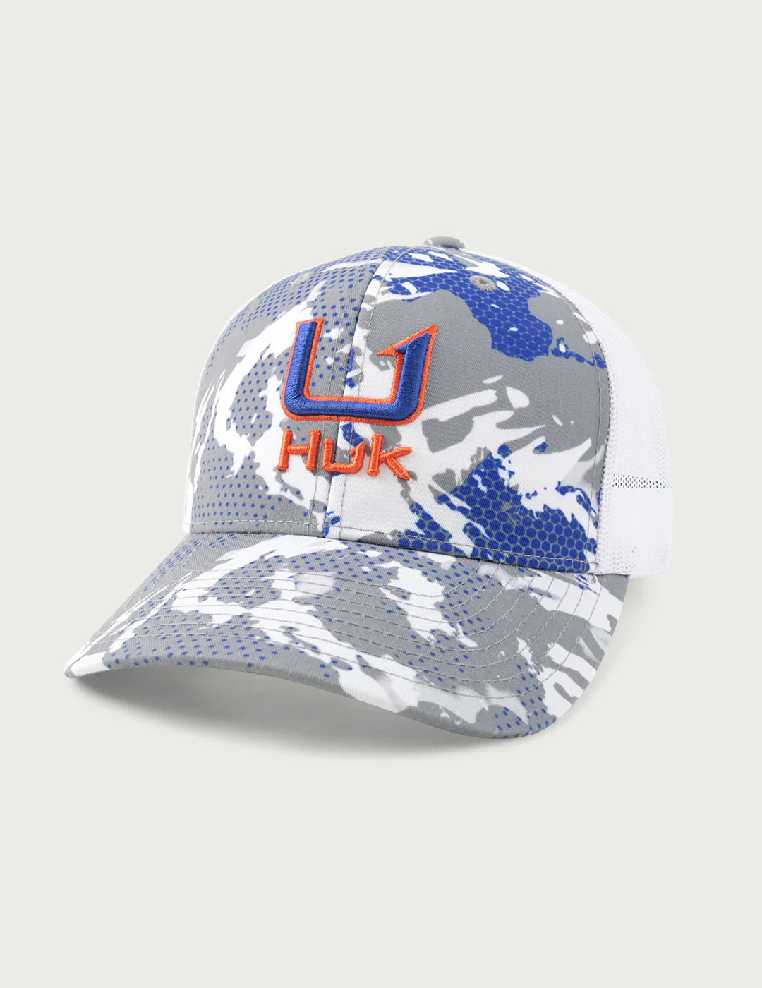 The KC Scott©️ printed trucker hat features a 3D embroidered Huk logo on a fabric patch, along with a sleek dark gray under visor to combat glare and a moisture-wicking sweatband for all-day comfort.